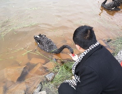 乘坐观光车抵达天鹅湖边,黑、白天鹅正悠闲地在水面嬉戏,远处青山如黛,近处碧水荡漾,一切显得那么安静闲适;水下偶见一条小鱼,天鹅便不时地将头埋进水里,去逮鱼吃。由于游人不多,我们的到来让天鹅们欣喜万分,许多天鹅便到水边与我们互动,讨点“口粮”,我们也十足过了一把喂天鹅的瘾。